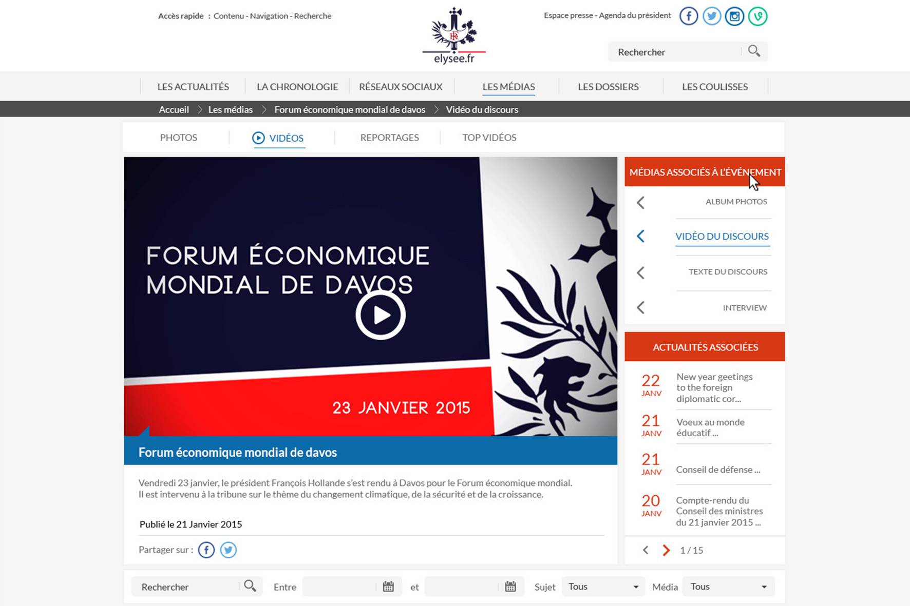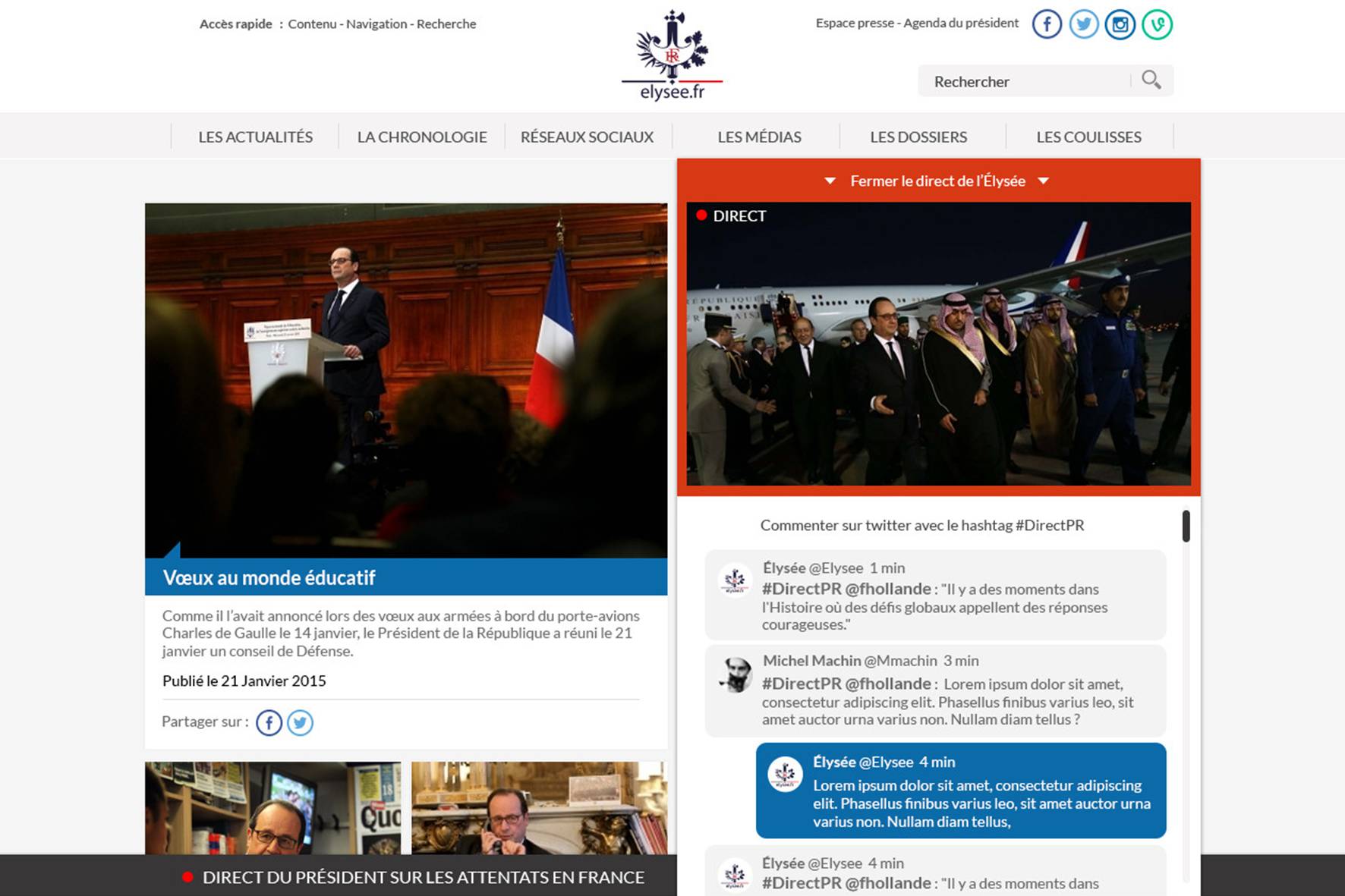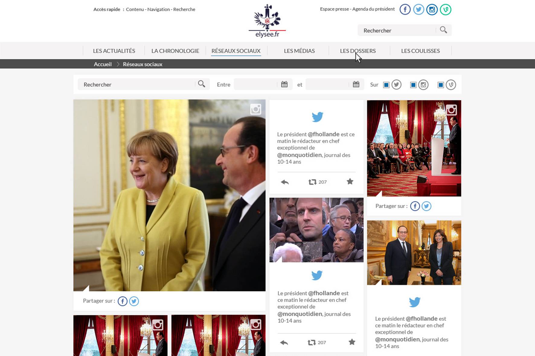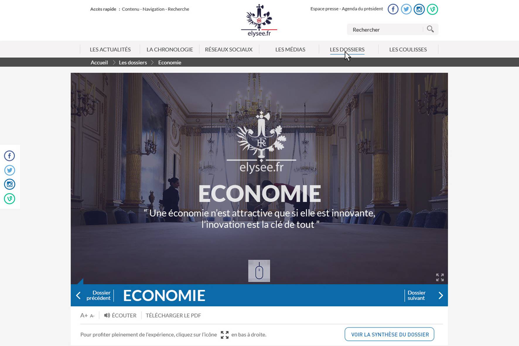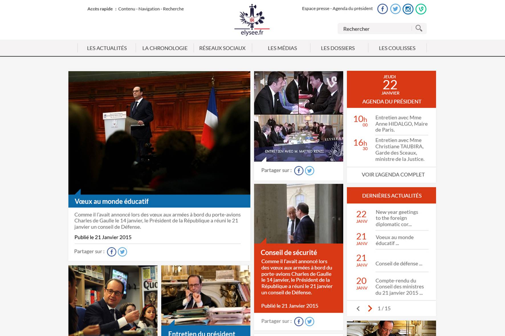 Refonte graphique du site Internet de l’Elysée dans le but de le moderniser : – Un design épuré – Une grande place accordée aux réseaux sociaux – Respect des normes RGAA permettant l’accessibilité du site aux personnes handicapées.