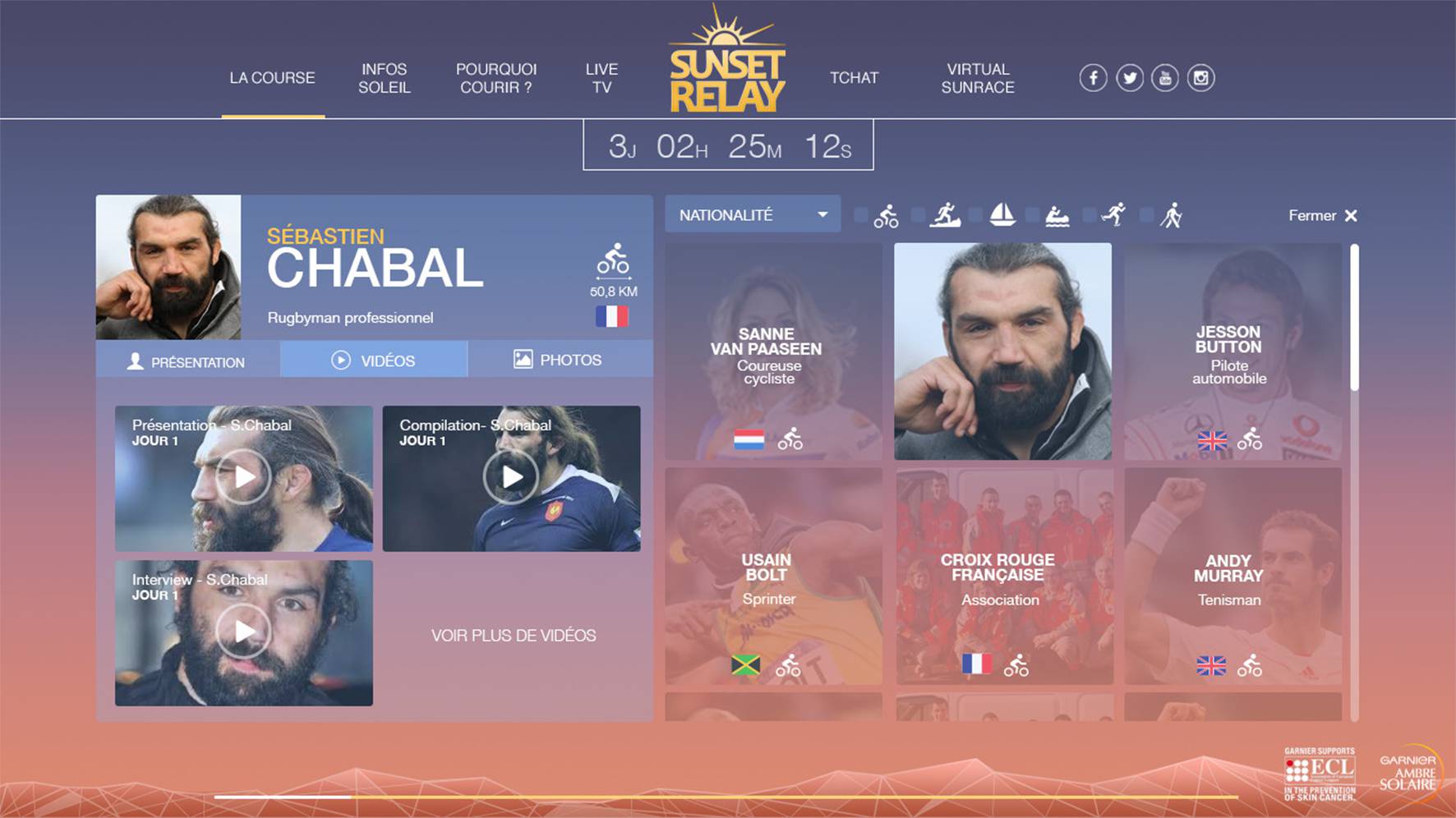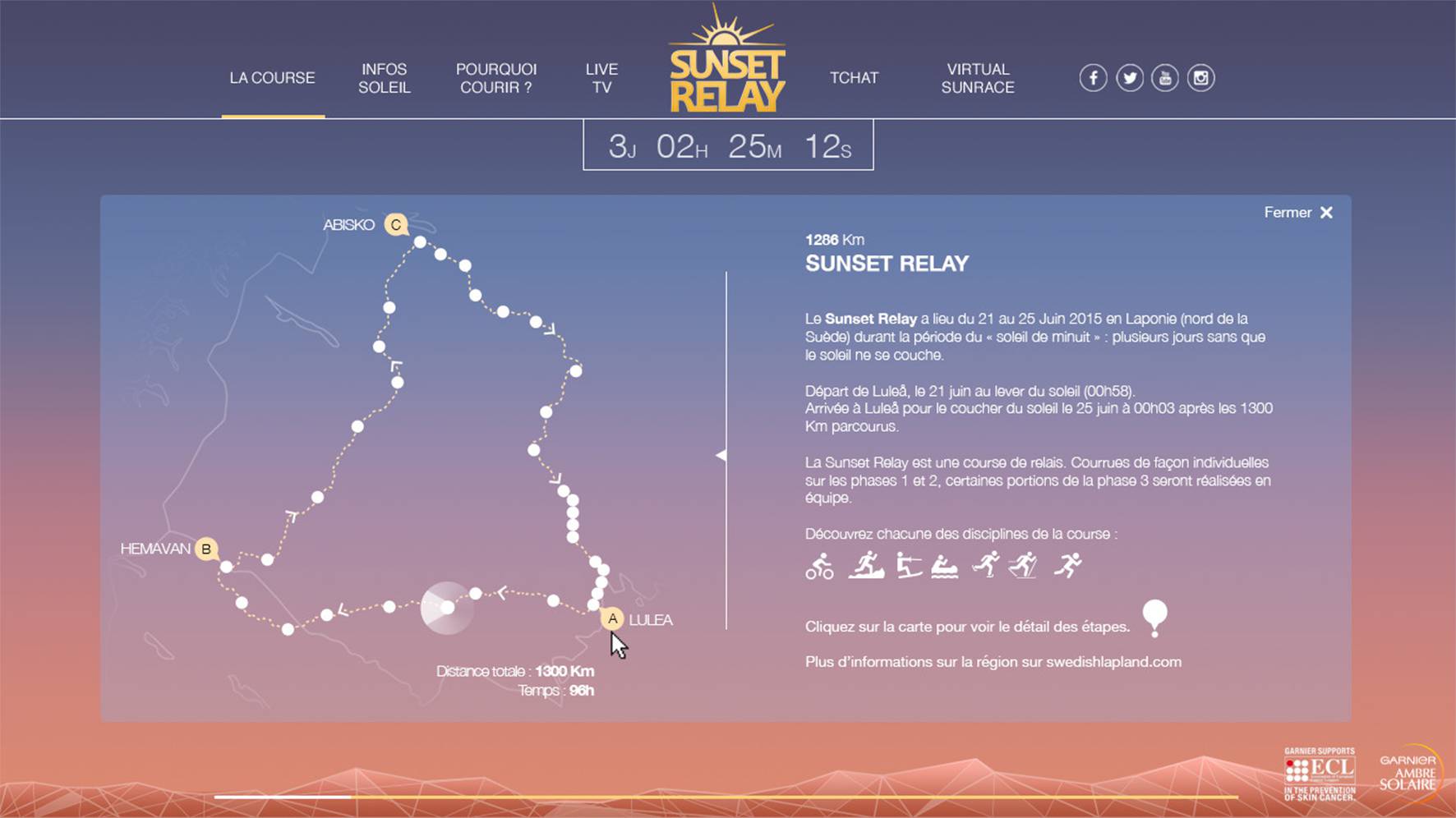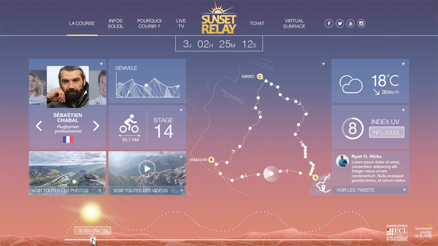 Conception et réalisation graphique d’un site internet chronologique permettant de suivre une course de 96h contre le soleil. Le site permet de suivre l’avancée des coureurs, la météo, leurs parcours, ainsi que les tweets et les photos publiés sur les réseaux sociaux.